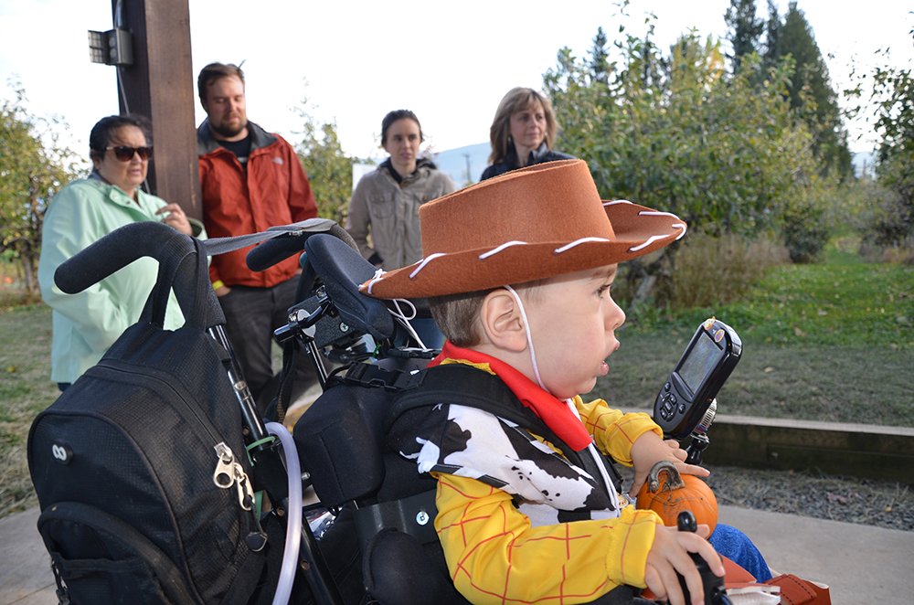 I love this photo that Alisha captured on her iPhone. The joy and excitement in Emmett’s expression. The way that he’s leaning forward. How his hand is gripping the joystick and urging the powerchair to go even faster. Clutching his stuffed hippo in the other hand as he drags it along on his journey. His costume – which I truly believe transports him to the Wild West where he is Woody the Cowboy on an adventure.